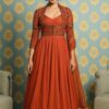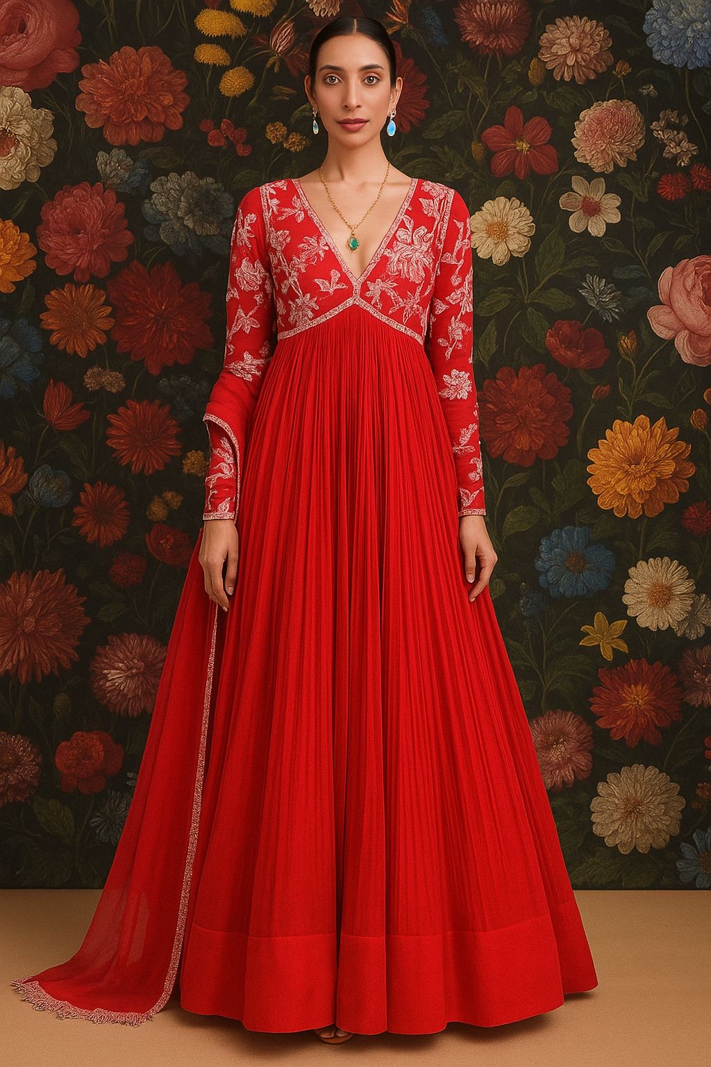 A stunning red floor-length anarkali featuring intricate ivory floral embroidery on the bodice and sleeves. Crafted in fine georgette with elegant pleats and a delicate dupatta, this ensemble exudes timeless grace and festive charm.