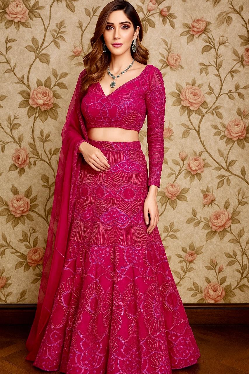 Magenta embroidered lehenga set featuring detailed cutdana and sequin work. The outfit includes a V-neck full-sleeve blouse, a flared skirt with intricate patterns, and a matching dupatta, perfect for festive and wedding occasions.