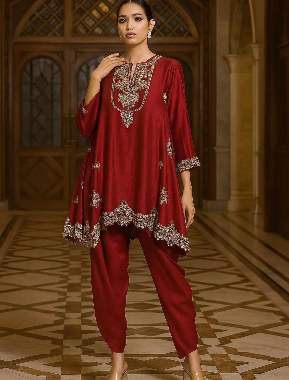 Exude royal charm in this deep red Zardosi embroidered kurta paired with sleek tulip pants perfect blend of elegance and contemporary style.